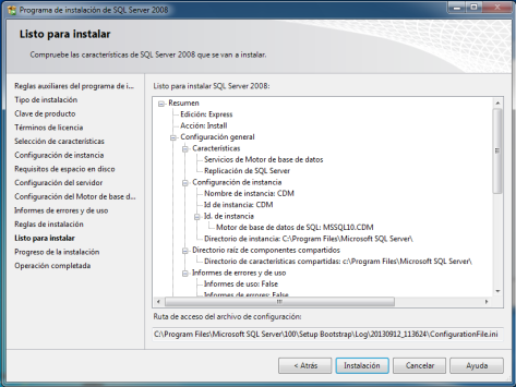 Tras revisar todos los parámetros de configuración del SQL Server, haga clic en “Instalación” para comenzar a instalarlo.
