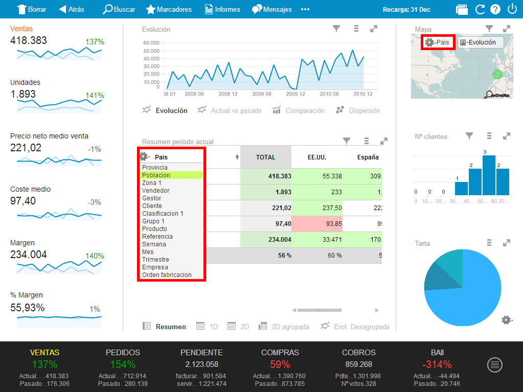 Bi2go le proporciona un análisis multidimensional, es decir, puede cambiar rápidamente la presentación de la información para verla desde otro punto de vista. La mayoría de los objetos le presentarán el botón