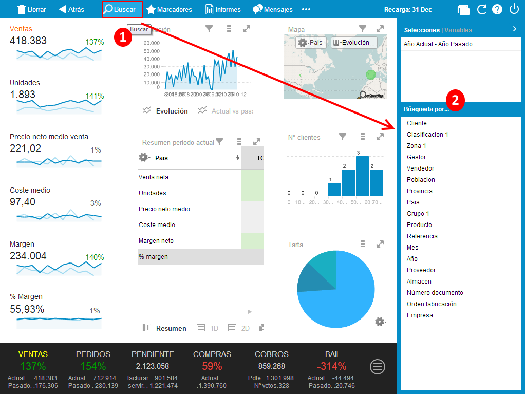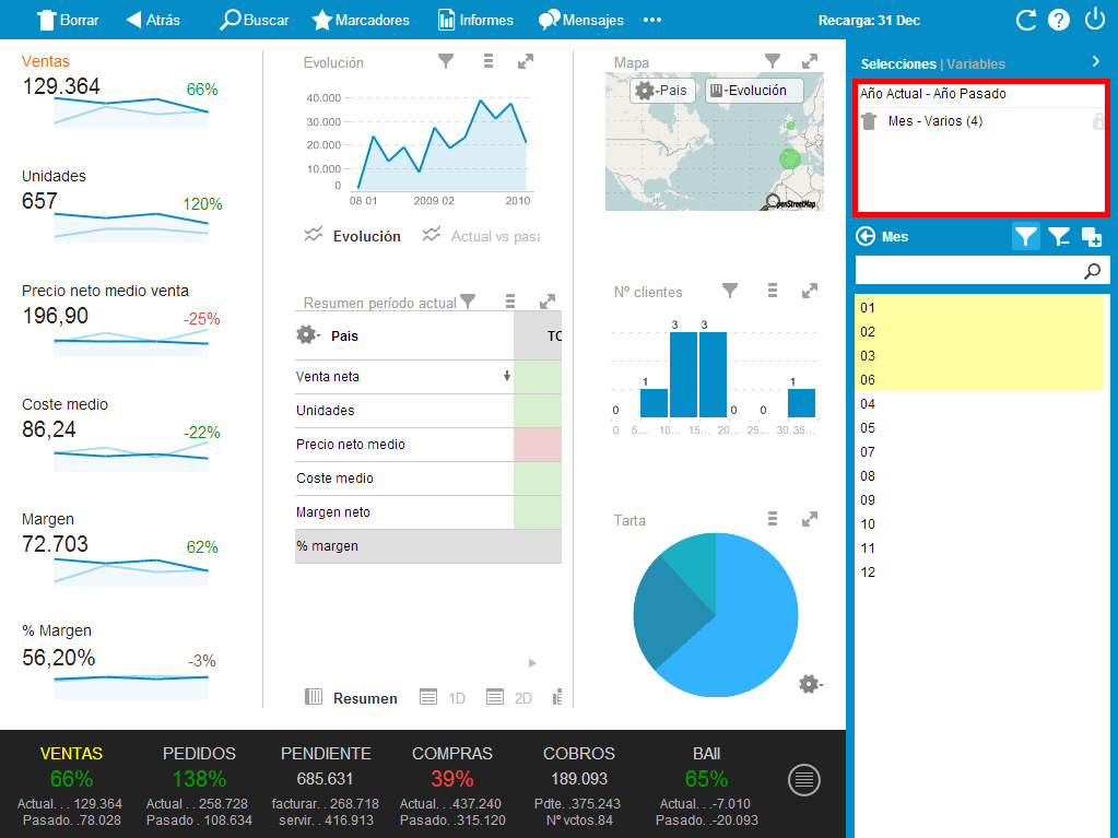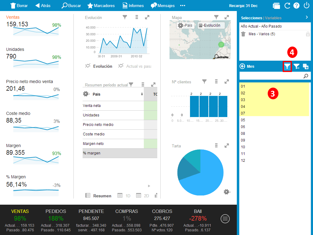 Haga clic con el ratón sobre el mapa/gráfico, en el área en la que quiera realizar la selección. Puede realizar varias selecciones. Luego haga clic en el botón filtrar .