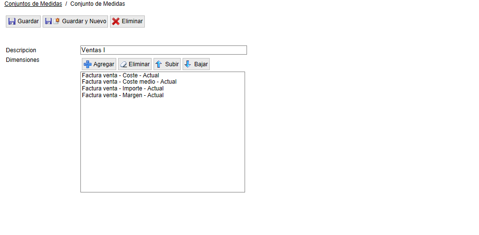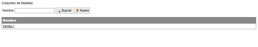 Si hace clic en esta opción, la primera pantalla que encuentra es la pantalla de búsqueda de conjuntos de medidas. Si rellena parcialmente el campo "Nombre" y pulsa el botón