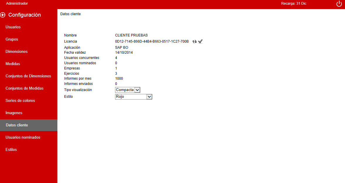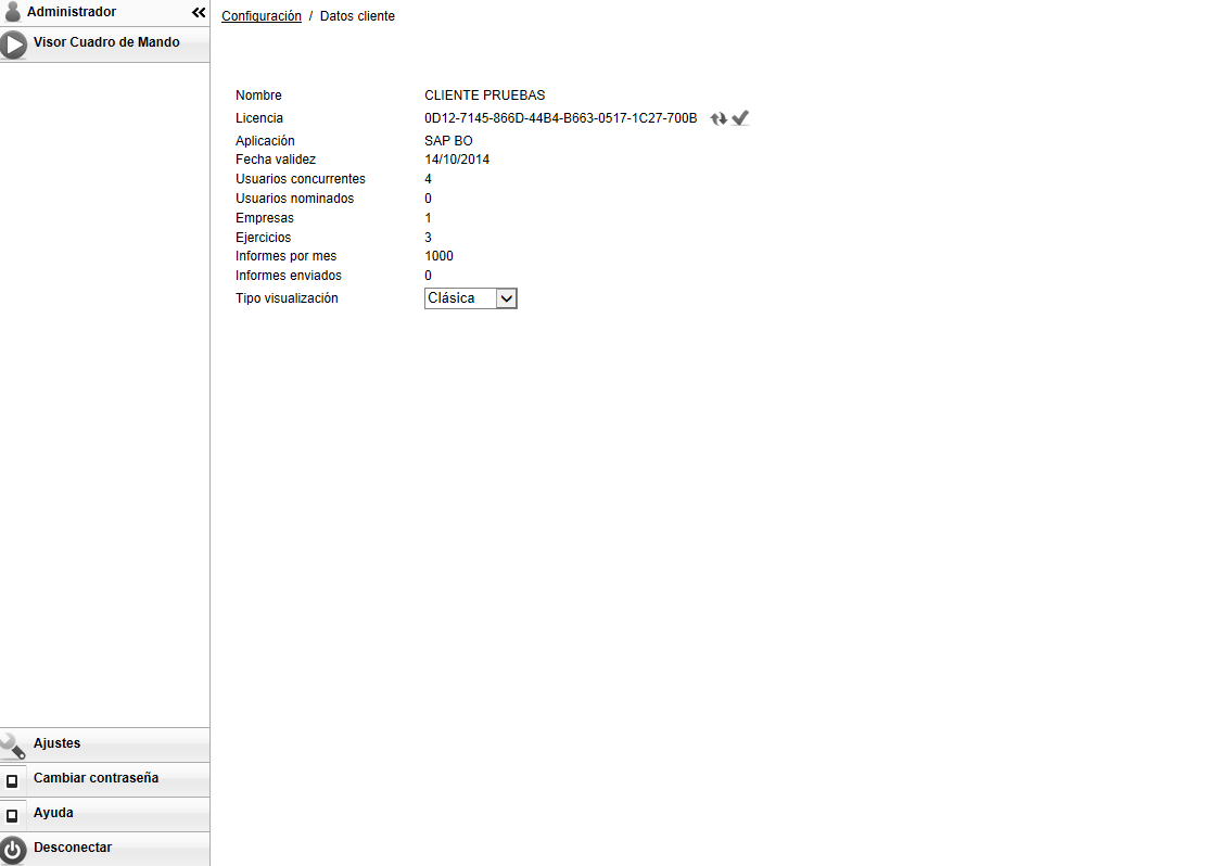Si hace clic en esta opción, le aparece una pantalla donde se muestran sus datos de cliente, la licencia y los parámetros de configuración.