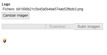 - "Logo". Permite subir una imagen como logo de cliente, para utilizarla en los objetos imagen o en los informes que indiquen. Para cambiar se pulsa sobre cambiar imagen, se selecciona una nueva imagen y se subir con el botón de "Subir Imagen". Si hay una imagen ya definida se mostrará debajo de la zona de selección.