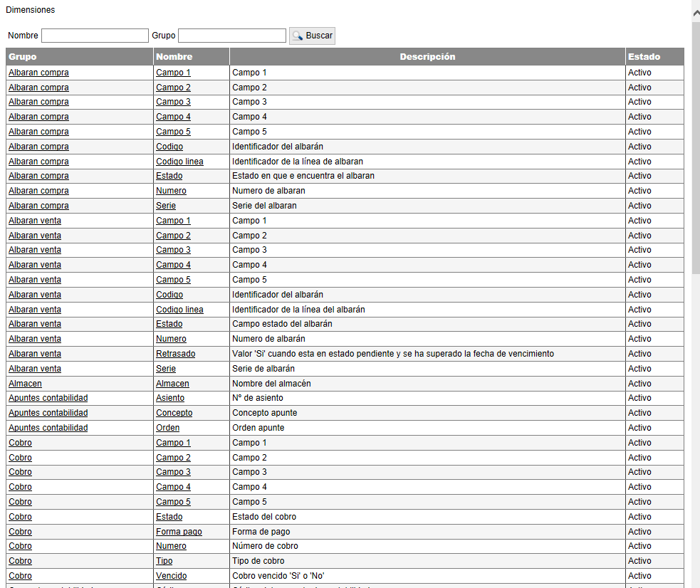 - "Estado". Indica si la dimensión está activa y puede ser usada o por el contrario está desactivada.