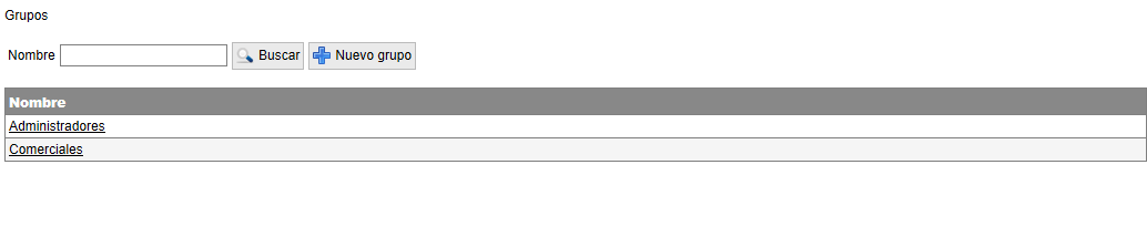 Si entra en la opción de grupos, la primera pantalla que encuentra es la pantalla de búsqueda de grupos de usuarios. Si rellena parcialmente el campo "Nombre" y pulsa el botón