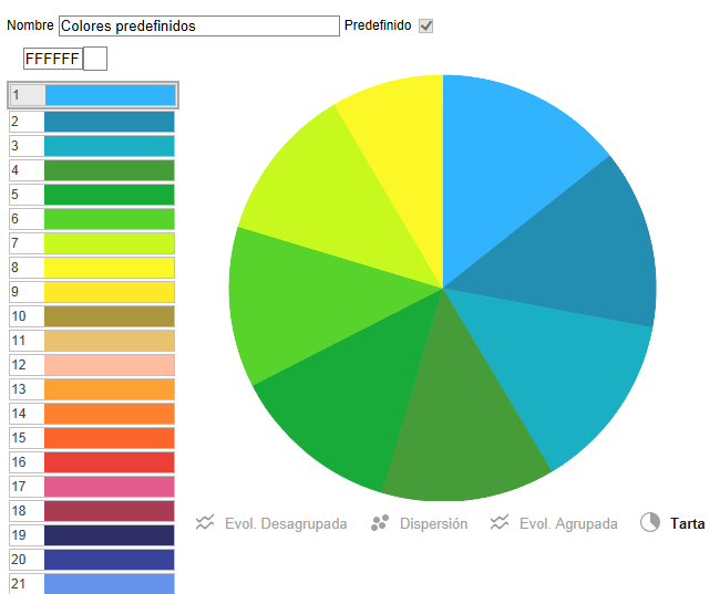 Un ejemplo del uso de las series de colores, es el siguiente gráfico de tarta. Los colores que usa la tarta, para mostrar los distintos valores, son los definidos en la serie "Colores predefinidos".