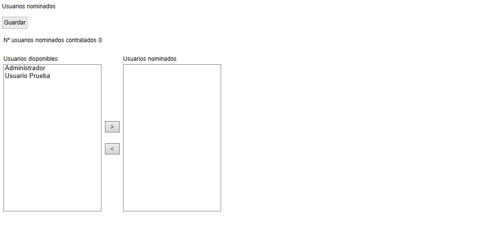 Esta pantalla le permite indicar que usuarios de los disponibles pasan a ser Nominados. Hay un número máximo de usuarios nominados, que también se muestra en la pantalla, y que depende de los que se hayan contratado.