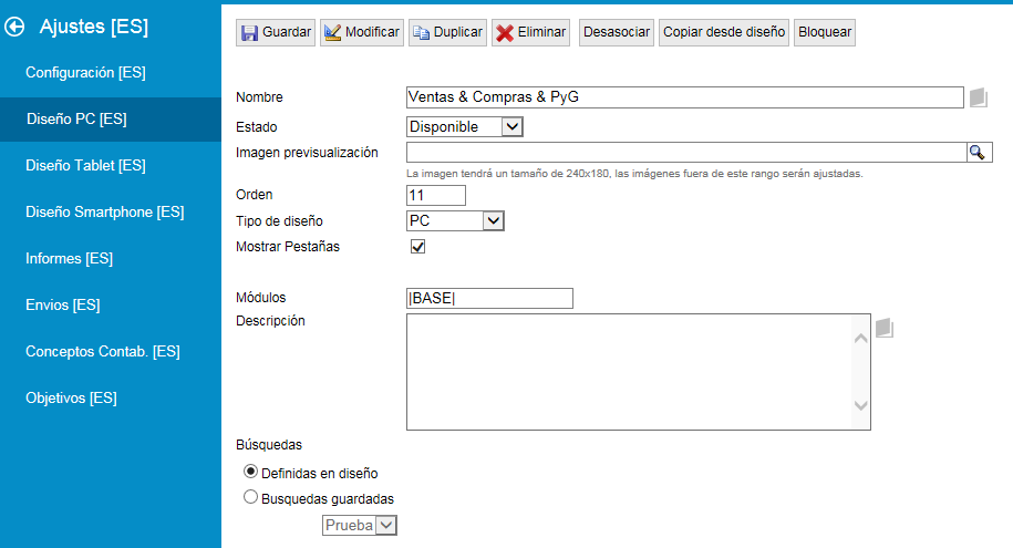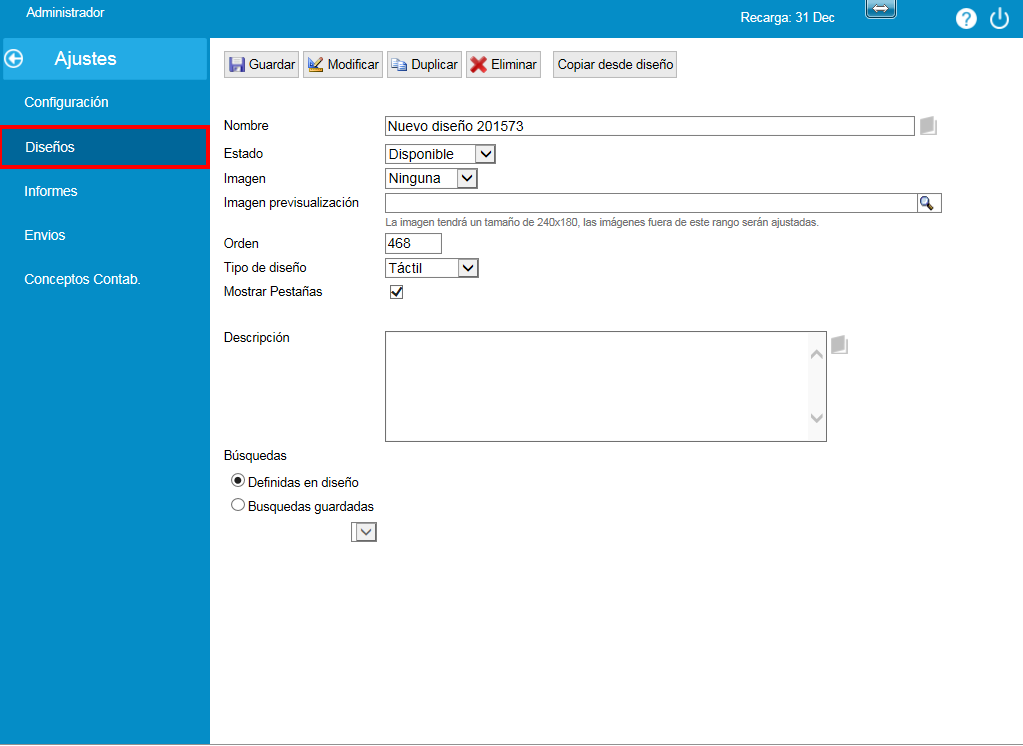 - Orden. Número asignado al diseño para determinar su posición dentro de la lista de diseños creados y disponibles en la opción