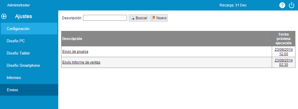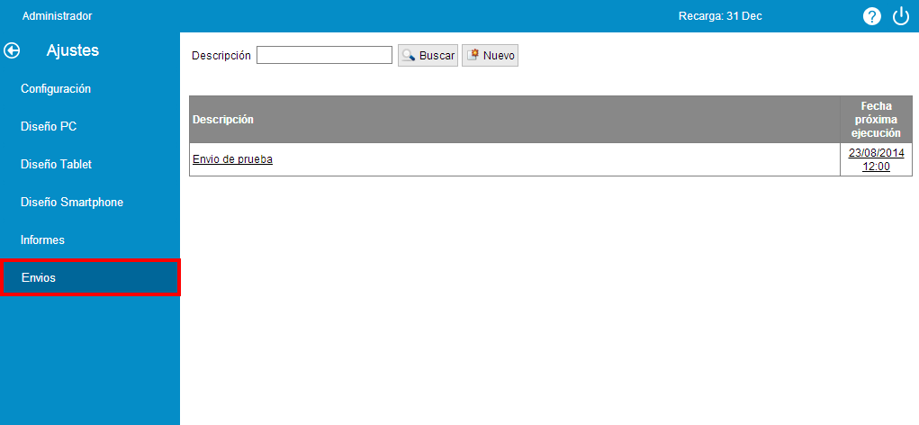 Se pueden crear nuevos envíos desde el botón "Nuevo" o bien seleccionar alguno de los que ya existen para modificar alguna de sus opciones o eliminarlos.