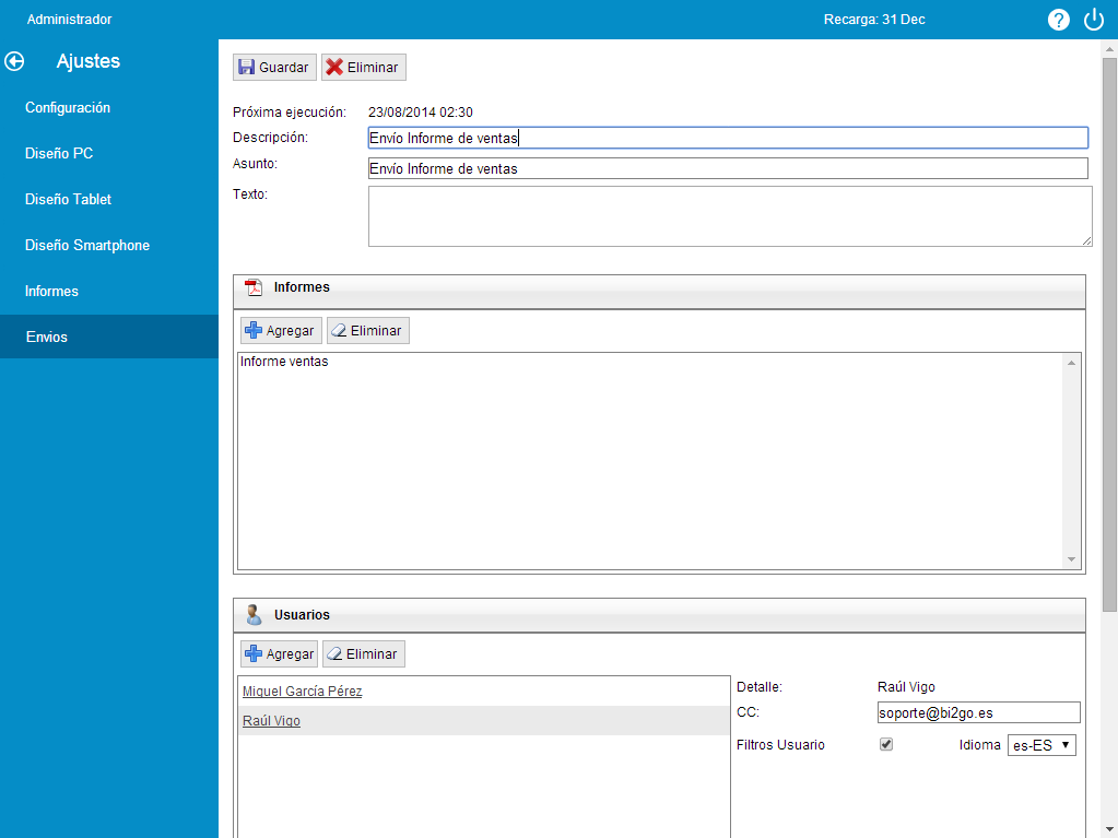La opción "Envíos" sirve para programar el envio automático de informes a uno o varios usuarios.