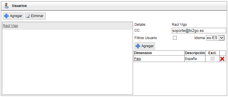 En la sección "Usuarios" se muestra una lista con los usuarios a los que se va a enviar el informe o informes seleccionados. En caso de no