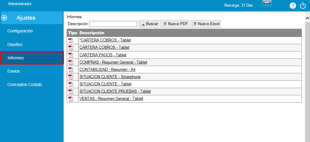 Si lo que desea es crear o modificar un informe, la opción "Informes" le permitirá gestionarlos. Se encuentra accediendo al menú lateral izquierdo.