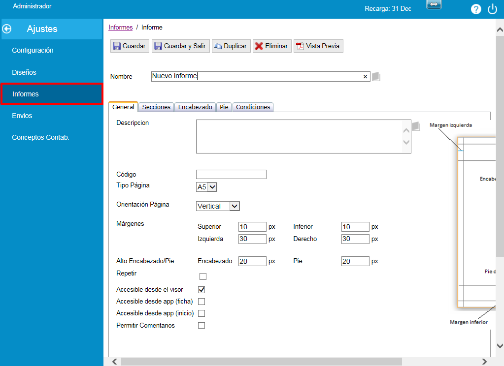 Cada una de las distintas opciones y pestañas se explicarán cuando detallemos el desarrollo de un informe.Los informes que puede diseñar deben tener formato pdf o formato Excel.