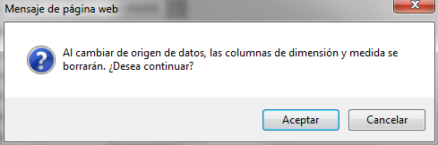 Los primero que hay que hacer es habilitar el objeto para que acepte estas columnas, ya que, por defecto, los objetos están habilitados para aceptar columnas de dimensión y medida. Para habilitar la nueva opción habrá que buscar el campo "Origen datos" y pulsar en "Cambiar". Al pulsar en cambiar saldrá un mensaje de texto indicando al usuario que se procederá a borrar las columnas dimensión-medidas, en el caso de que se haya incluido alguna, ya que no se podrán combinar columnas de un origen y otro.