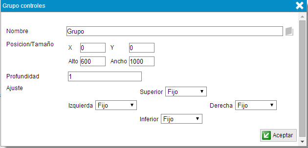 En la figura anterior, se crea un grupo de control con nombre "Grupo" y se le asigna una posición, un tamaño y un ajuste de tipo "Fijo". Este grupo de control