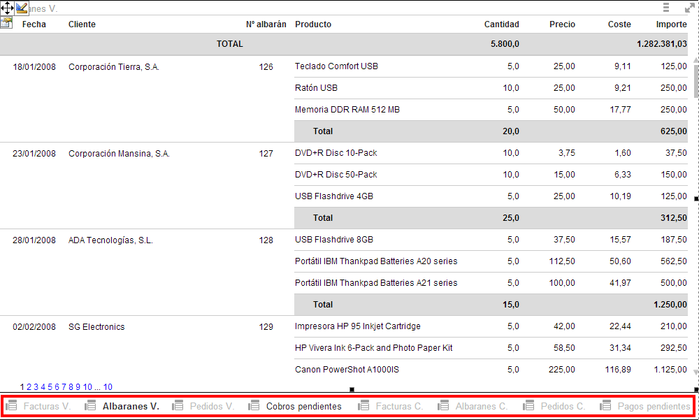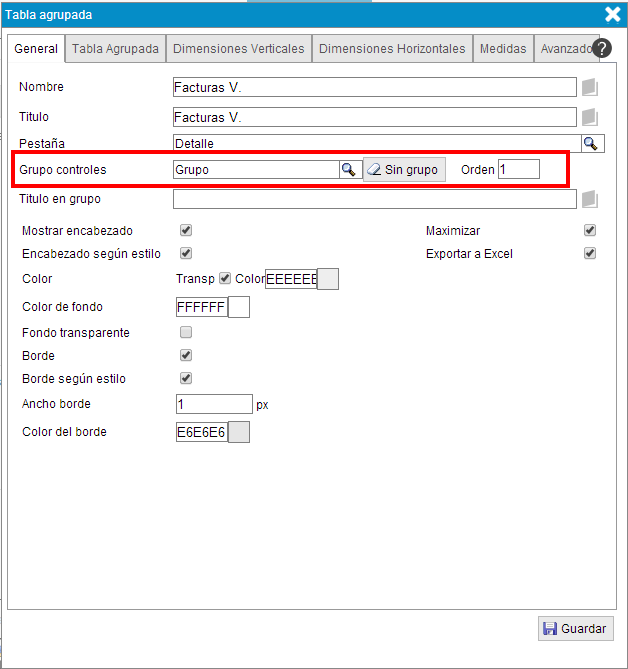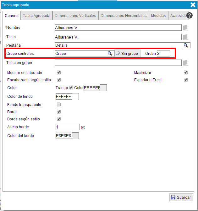 Para el siguiente elemento a mostrar, en este caso la tabla "Albaranes venta" se repiten los mismo pasos y se le asigna el mismo grupo de control con "Orden" 2.