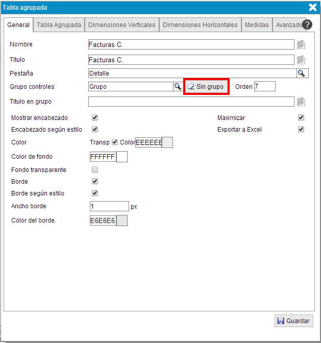 asigna al campo "Orden" un "1". En la siguiente figura se muestran estos cambios realizados sobre las propiedades de la tabla agrupada "Facturas venta". Al terminar, pulsar en el