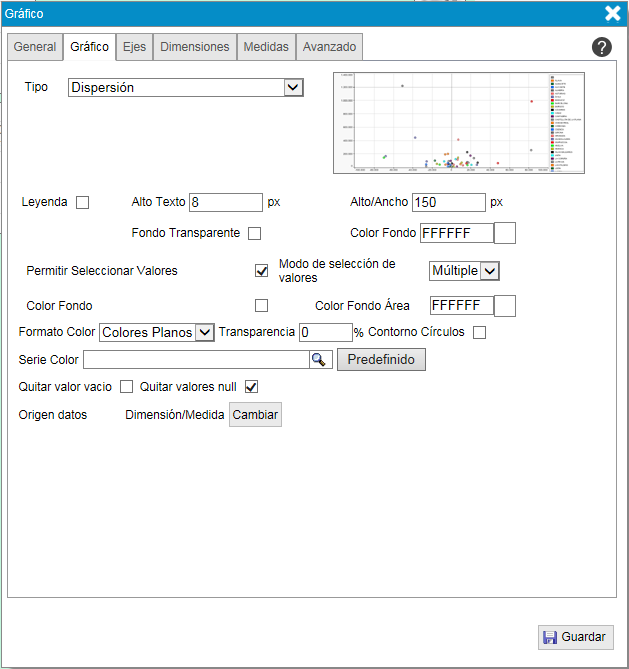 - "Leyenda". Indica si se muestra o no la leyenda junto al gráfico de dispersión.
