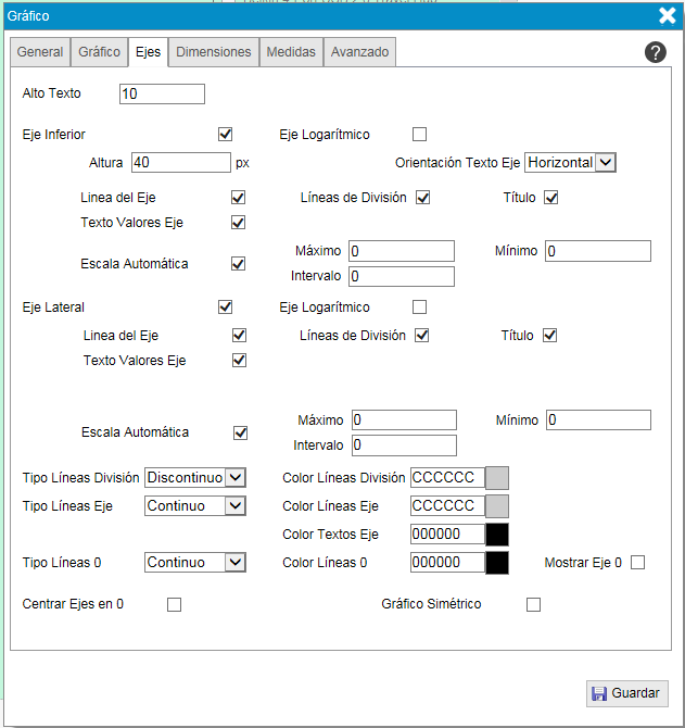 - "Alto texto". Tamaño del texto que se muestra en los ejes del gráfico.