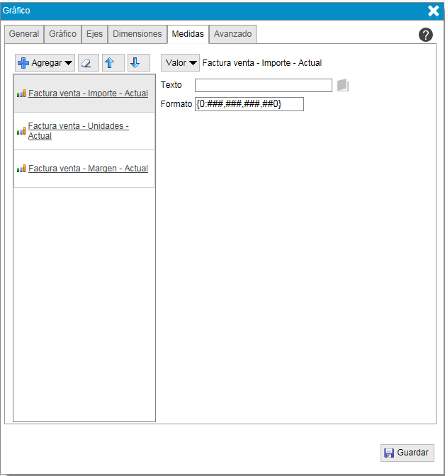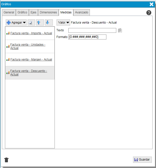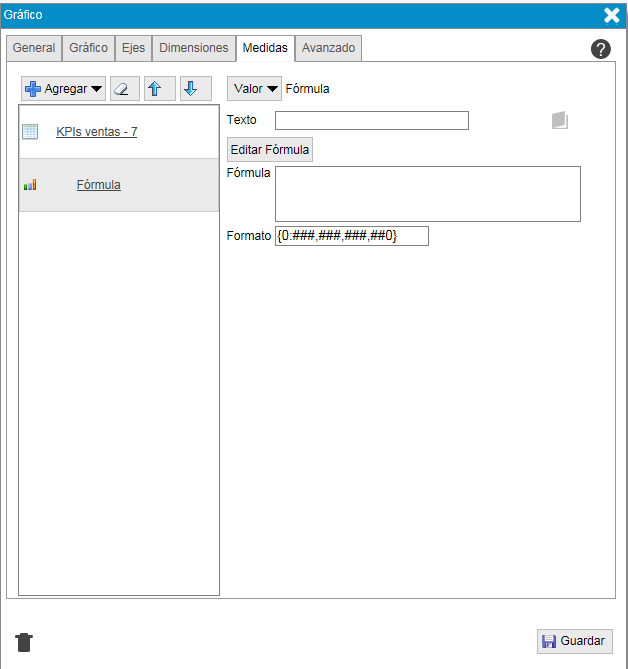 - "Formato". Indica como se mostrará el resultado númerico de la medida, columna de la tabla resumen o fórmula.