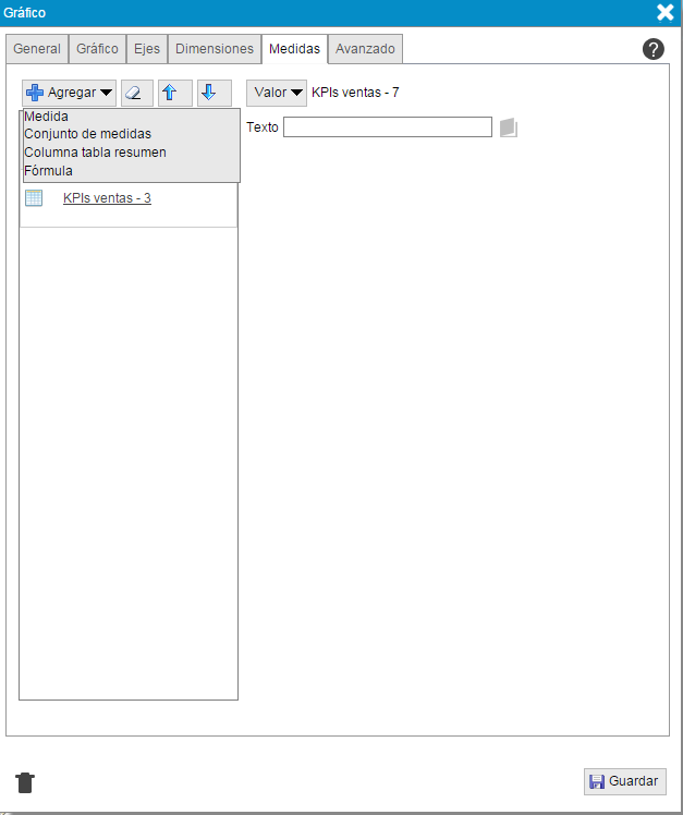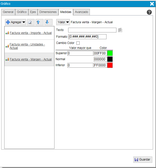 - "Texto valores Eje". Indica si se muestran o no los distintos rangos entre los que se posiciona el valor de la medida.