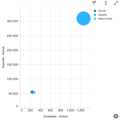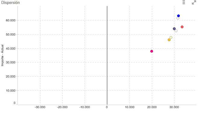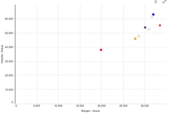 A continuación le muestro un gráfico de dispersión con tres valores en la pestaña de medidas. El valor de la medida Margen - Actual será el que determine el tamaño del círculo .