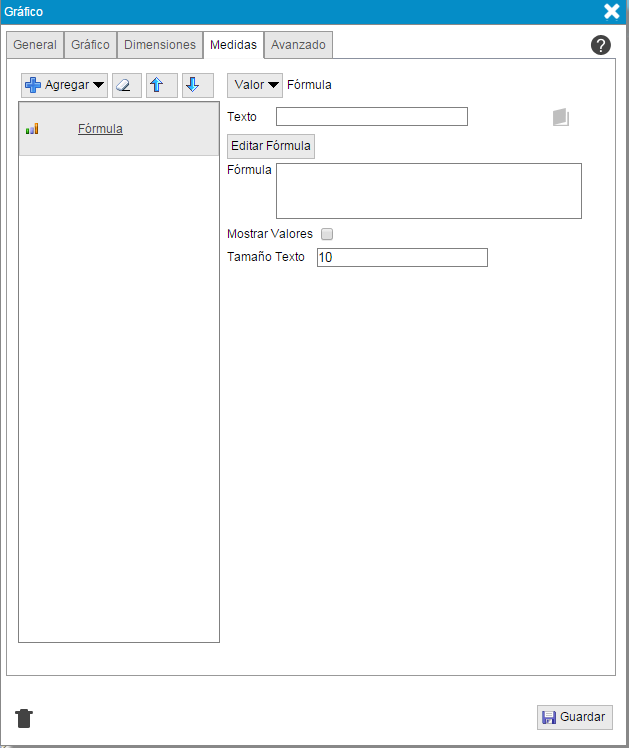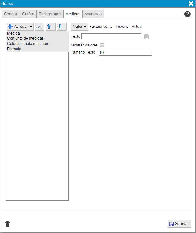 En esta pestaña puede añadir una medida, una columna de una tabla resumen del diseño, un conjunto de medidas o una formula.