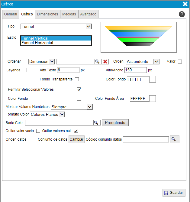 - "Leyenda". Indica si se muestra o no la leyenda junto al gráfico funnel.