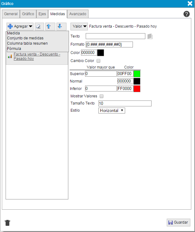 - "Color". Color de la columna del gráfico que muestra la medida o la columna de la tabla resumen.Si el estilo del gráfico es líneas, el color de la línea se corresponde con el campo color de la primera medida.