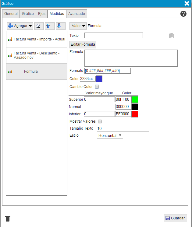 - "Máximo". Si está desmarcada la casilla de la escala automática, es el valor máximo que va a tener la escala en el eje de medida.