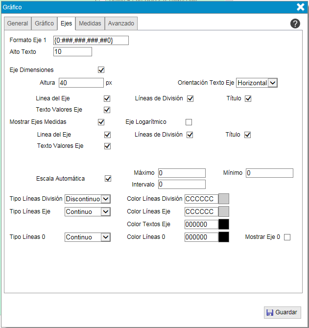 - "Formato Eje 1". Formato de los valores numéricos que se muestran en los ejes del gráfico.