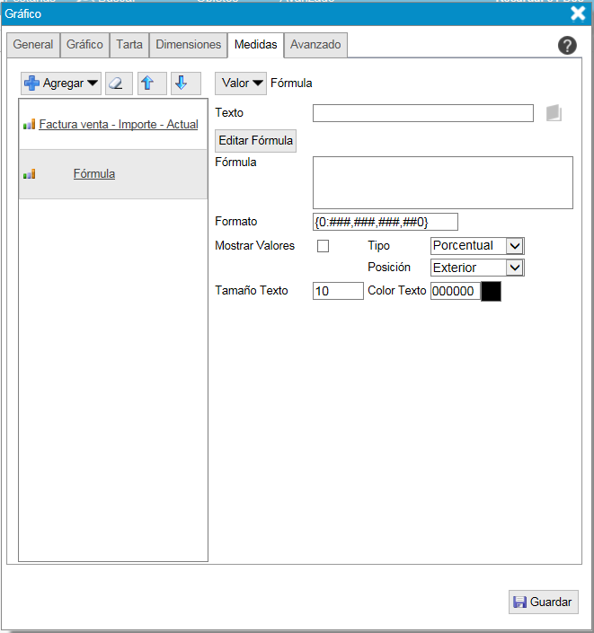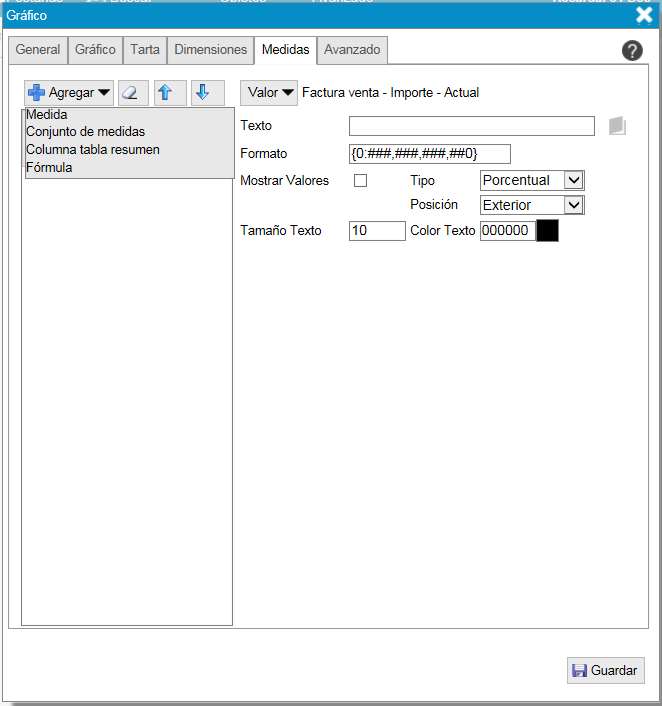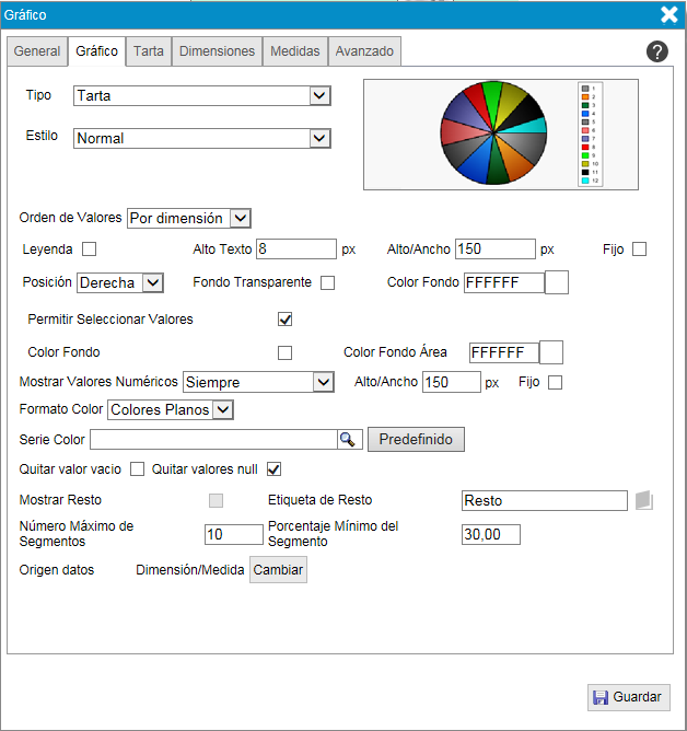 - "Mostrar valores". Indica si se muestran o no los valores de la medida en los segmentos de la tarta.