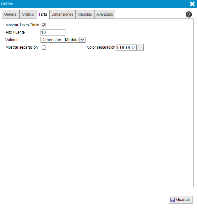 - "Leyenda". Indica si se muestra o no la leyenda junto al gráfico de tarta.