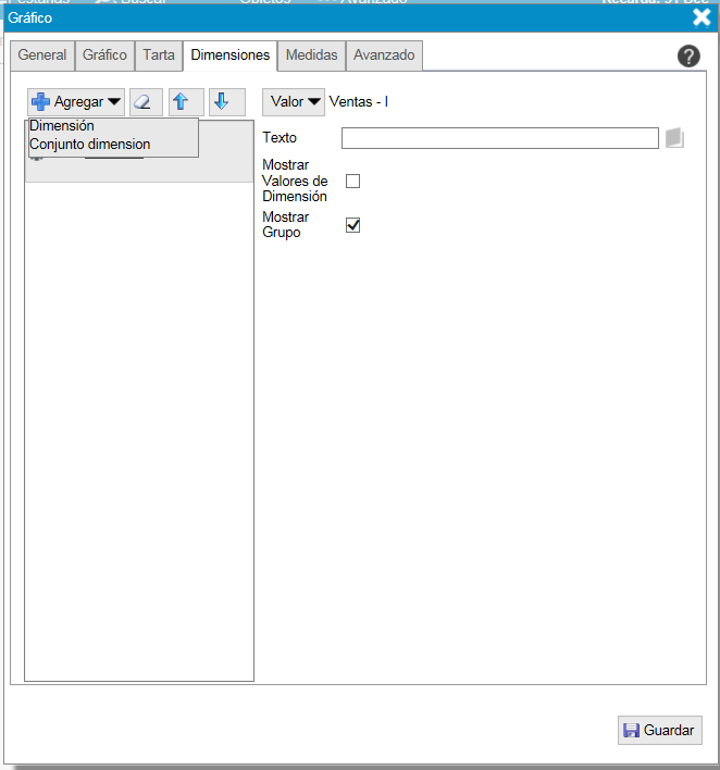 - "Mostrar el grupo". Si en la pestaña de "Dimensiones" ha seleccionado un Conjunto de dimensiones, con está opción indicará si se muestra o no la ruleta para poder seleccionar una dimensión de las que componen el conjunto.