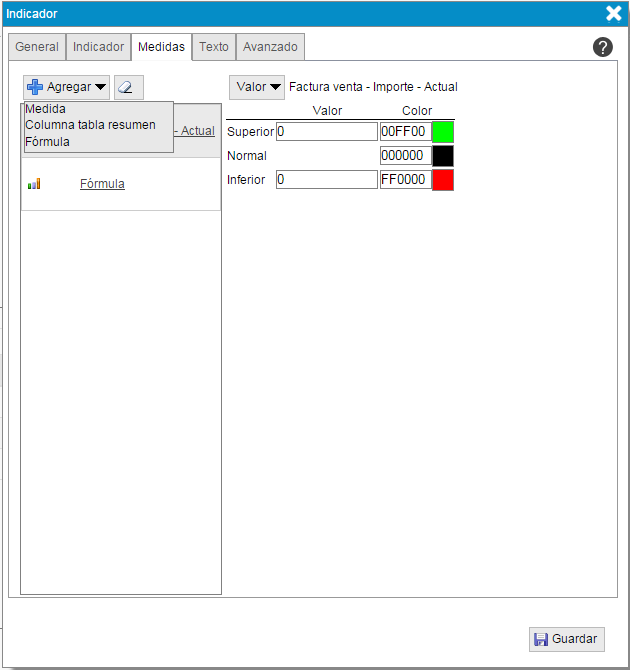 Si el resultado de la medida o columna de la tabla resumen está por encima de un valor fijado,el indicador tendrá un determinado color, lo mismo ocurre si está por debajo de un valor o dentro del intervalo de valores.
