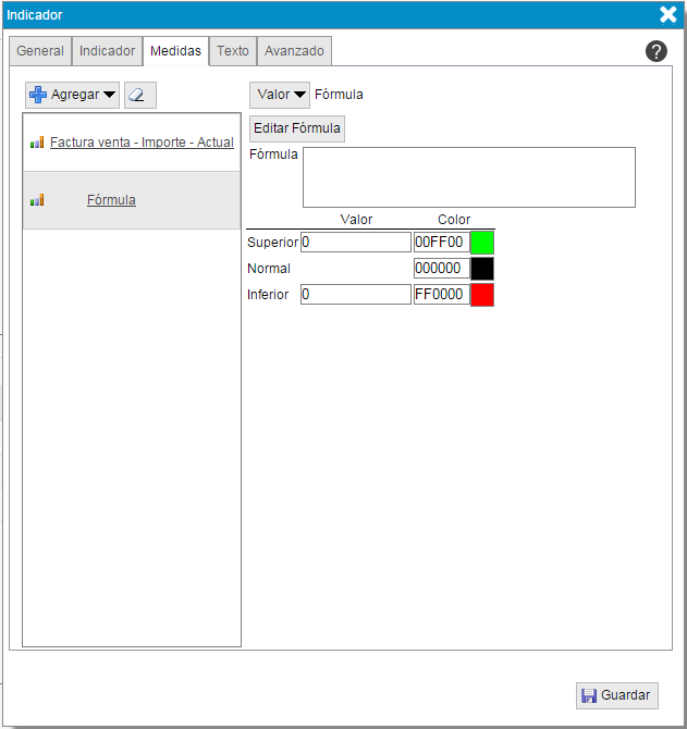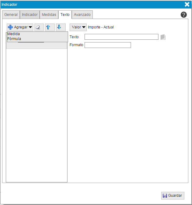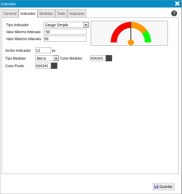 Si el valor del "Tipo Indicador" es gauge simple,la pestaña "Texto" no se utiliza y las pestañas "Indicador" y "Medidas" son las siguientes:
