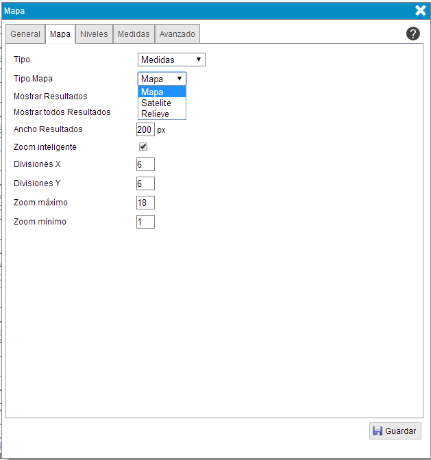 - "Tipo Mapa". Si trabaja con Google Maps, el mapa tiene tres formatos distintos: Mapa, satélite y relieve.