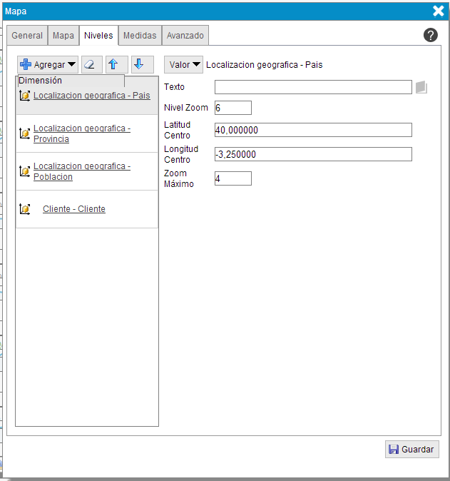 En esta pestaña puede seleccionar una o varias dimensiones sobre la que se van a calcular las medidas o las columnas de la tabla resumen. Cuando se filtre por un valor de nivel en el visor, se cambiará al siguiente nivel definido.