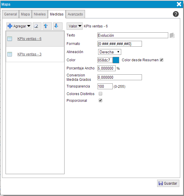 - "Color". Color de las bolas que muestran la medida o la columna resumen en el mapa.