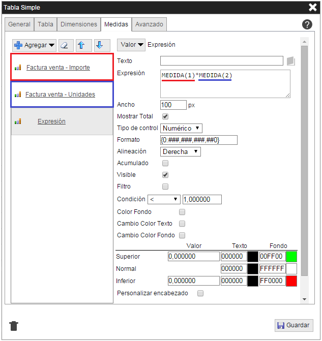 Las medidas de expresión son un tipo de medidas que habilitan operaciones entre diferentes columnas o filas del objeto, mostrando en esa columna el resultado de las operaciones definidas. Este tipo de medidas sólo están habilitadas para los objetos tabla simple y tabla invertida.