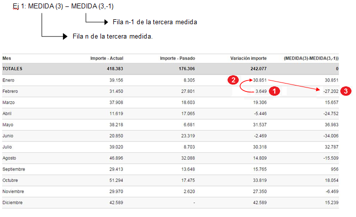 - MEDIDA(N, ± n). Para realizar operaciones entre distintas celdas de una medida. El valor que se devolverá es de n posiciones anteriores o posteriores a la actual.