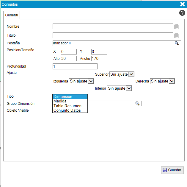 - Tipo. Que tipo de objeto se controlará: Conjuntos de dimensiones, conjunto de medidas, tabla resumen y conjuntos de datos definidos.