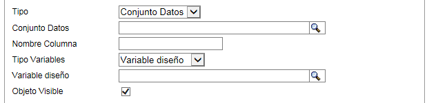 En el caso que se seleccione el tipo conjunto de datos, habrá que definir unos campos más para su funcionamiento. Habrá que seleccionar una columna del conjunto de datos para que se puedan mostrar sus valores en el desplegable. Además habrá que definir también una variable en donde se almacenará el índice del valor seleccionado.