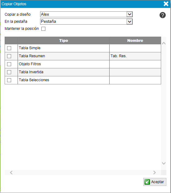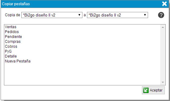 Debe indicar un diseño origen y un diseño destino, se mostrarán todas las pestañas del diseño origen para que pueda seleccionar la que quiere copiar al diseño destino,finalmente debe hacer clic en el botón Aceptar.