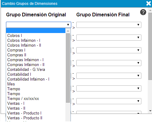 En el grupo de dimensión original debe seleccionar el grupo que quiere sustituir y en el grupo de dimensión final debe indicar el grupo que quiere que lo sustituya en el diseño.