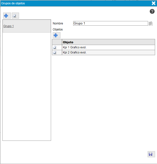 Esta opción permite agrupar los objetos en grupos. Estos grupos se usarán en acciones de objetos, como en la tabla resumen para señalar si se mostrarán o no, al estar seleccionada la fila, para no tener que seleccionar los objetos uno a uno.
