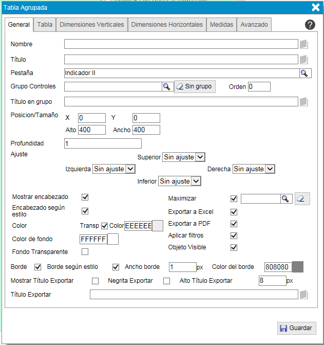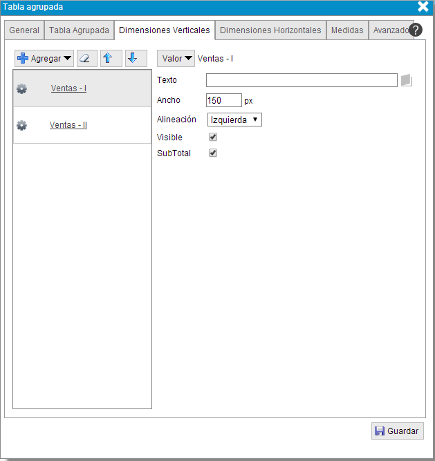 - Ancho. Número de píxeles que medirá de ancho la columna que contendrá los valores de esa medida o grupo de medidas.