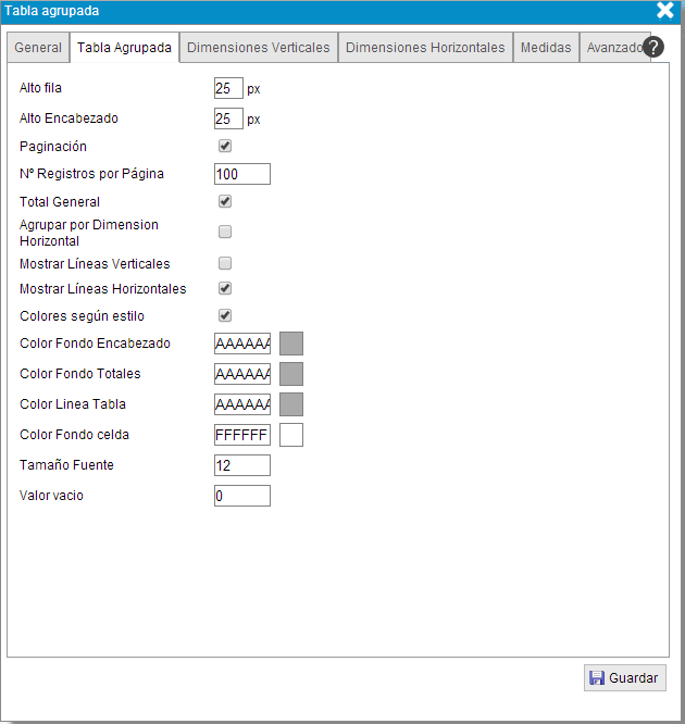 - Ancho. Número de píxeles que medirá de ancho la columna que contendrá los valores de esa dimensión o grupo de dimensiones.