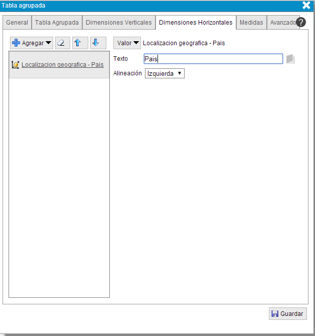 - Alineación. Posición horizontal del contenido de la columna, que contendrá los valores de esa dimensión o grupo de dimensiones, donde se sitúa el texto dependiendo