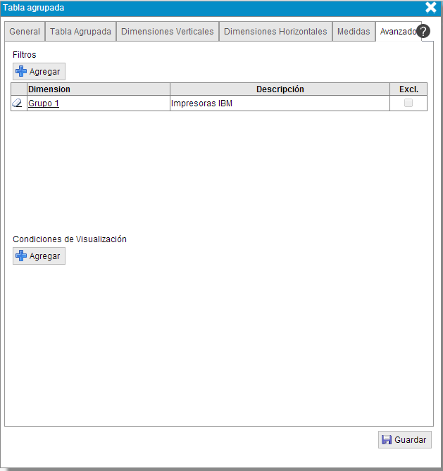- Visible. Opción que permite mostrar u ocultar la columna que contendrá los valores de la dimensión o grupo de dimensiones.