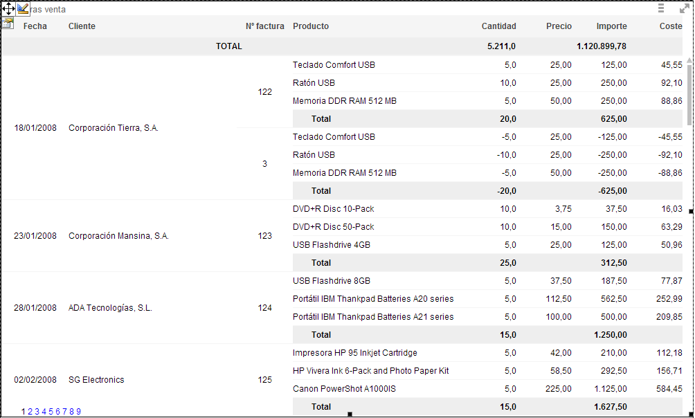 En la siguiente figura se puede ver una tabla agrupada creada con varias dimensiones verticales que son la fecha, el cliente,